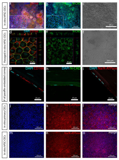 After a week of the differentiation, the mesenchymal-like structures outcompeted the CEnC-like cells. Passaging the cells considerably refined the cell culture, although some mesenchymal-like cells remained after the passage. Regardless, the cell monolayer kept its polygonal morphology and positivity of ZO-1, CD166 and N-cadherin (Figure 7a–e). While pursuing clinically relevant hPSC-CEnCs, it is crucial to compare the cells with primary CEnCs. When we compared our differentiated hPSC-CEnC-like cells (Figure 7d–f,m–o) with in vitro cultured primary human CEnCs (Figure 7j–l) or histological corneal cross-section samples (Figure 7g–i), we confirmed a clear similarity between these cell types, as demonstrated with the expression of CD166, Na+/K+-ATPase, N-cadherin and ZO-1 (Figure 7d,e,m–o).