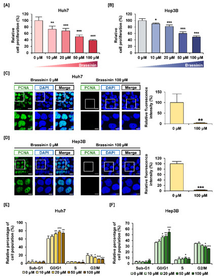Figure 1. Effects of brassinin on proliferation and cell cycle of human hepatocellular carcinoma (HCC) cells. (A,B) The proliferation of Huh7 and Hep3B cells in response to brassinin. Results were compared to vehicle-treated cells. (C,D) Green fluorescence represents proliferating cell nuclear antigen (PCNA) and blue fluorescence represents DAPI as counterstaining for nuclei. Scale bar: 20 µm (top line) and 40 µm (bottom). (E,F) Cell cycle distributions. The graphs show the relative cell population compared to the control. Asterisks represent the significance levels between vehicle-treated cells and brassinin-treated cells (* p < 0.05, ** p < 0.01 and *** p < 0.001).