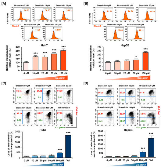 We assessed the relative levels of Ca2+ in mitochondria using Rhod-2 dye and the MMP using JC-1 dye (Figure 2). A dose of 100 µM brassinin increased the mitochondrial calcium ions concentration to 253% (*** p < 0.001) in Huh7 cells and 227% (*** p < 0.001) in Hep3B cells (Figure 2A,B). Also, brassinin increased the loss of MMP by 4.4-fold (*** p < 0.001) in Huh7 cells and 5.8-fold (*** p < 0.001) in Hep3B cells compared to the vehicle group (Figure 2C,D). Valinomycin (Val), the potassium ionophore, was used as a positive control for MMP. In addition, we performed western blot analysis for MMP-related proteins. In response to brassinin treatment (0, 20, 50 and 100 µM), phosphorylation of BAD and BCL-2 was decreased in Huh7 cells (Figure S3). Also, expression of BAK and BAX was increased in brassinin-treated Huh7 cells but the expression of MMP-related proteins in brassinin-treated Hep3B cells showed no significant changes (Figure S3). Taken together, these results indicate that brassinin disrupts mitochondrial homeostasis in Huh7 and Hep3B cells.