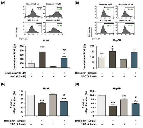 Figure 4. Effects of N-acetyl-L-cysteine (NAC) on brassinin-induced ROS generation and antiproliferative effects in HCC cells. (A,B) ROS generation by cells treated with N-acetyl-L-cysteine (NAC, a ROS scavenger, 0.5 mM), brassinin (100 µM) or both. (C,D) Proliferation of cells treated with N-acetyl-L-cysteine (NAC, a ROS scavenger, 0.5 mM), brassinin (100 µM) or both. Asterisks represent the significance levels between vehicle-treated cells and NAC-treated cells (* p < 0.05 and *** p < 0.001). In addition, # indicates significant differences as compared with brassinin alone (# p < 0.05 and ## p < 0.01).