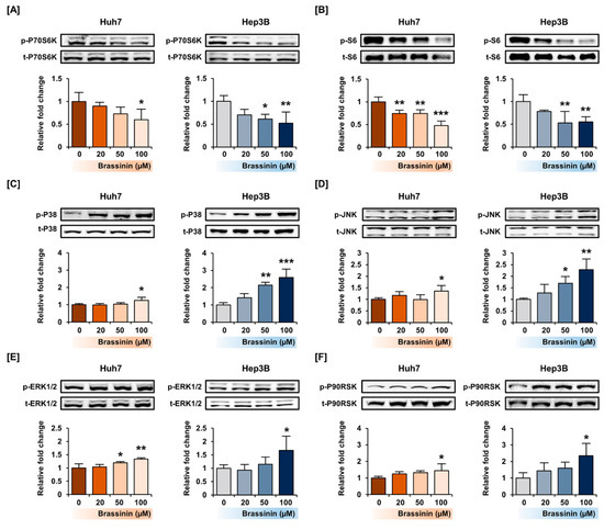 Figure 5. Activation of the PI3K/AKT and MAPK signaling pathways by brassinin in Huh7 and Hep3B cells. (AE) Phosphorylation of P70S6K (A), S6 (B), P38 (C), JNK (D), ERK1/2 (E) and P90RSK (F). The standardized values of the phosphorylated proteins were estimated relative to the amount of total protein. Asterisks represent the significance levels between vehicle-treated cells and brassinin-treated cells (* p < 0.05, ** p < 0.01 and *** p < 0.001).