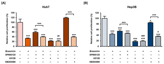 Figure 6. Antiproliferative effects of MAPK pharmacological inhibitors with or without brassinin in HCC cells. (A,B) Proliferation of cells treated with 20 µM SP600125 (JNK inhibitor), U0126 (ERK1/2 inhibitor) or SB203580 (P38 inhibitor) with or without brassinin (100 µM). Results were compared with vehicle-treated cells, brassinin-treated cells and each inhibitor-treated cells. Asterisks represent the significance levels between the vehicle-treated cells and the inhibitor-treated cells (* p < 0.05 and *** p < 0.001). # indicate the significance levels between brassinin-treated cells and cells treated with brassinin and each inhibitor (# p < 0.05, ## p < 0.01 and ### p < 0.001).