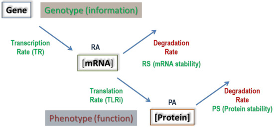 The six variables of the gene expression flux. The genetic information (genes = genotype) is transcribed to mRNAs, of which the concentration (RA), under steady-state conditions, depends on the equilibrium between synthesis (TR) and the degradation rates (herein expressed as the reverse parameter, mRNA stability: RS). The phenotype is, however, dependent mainly on the protein concentration (PA), which, in turn, depends on their synthesis (TLRi) and degradation rates (or stabilities, PS). See the main text for additional explanations.