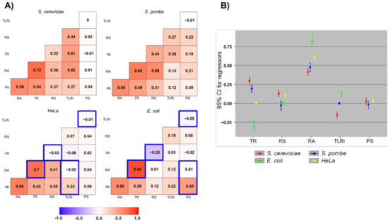 Correlations between the six variables of the gene expression in four model organisms. (A) The pairwise Pearson’s correlations among the six variables in each organism. Exact values are indicated in frames. The background color scale indicates positive (red) or negative (blue) correlations. Some correlations are less reliable because they are between the variables calculated from some others in HeLa and E. coli (see the main text) and are marked with blue boxes. (B) Estimation of the coefficients of a multiple regression model per organism using Bayesian model averaging (posterior mean and 95% credible interval). These coefficients show the contribution of each variable across organisms to the final protein amount (PA) using a Z-score scale to make them comparable. The TLRi for HeLa and the PS for E. coli are not shown because they were mathematically calculated from PA values (see Materials and Methods).