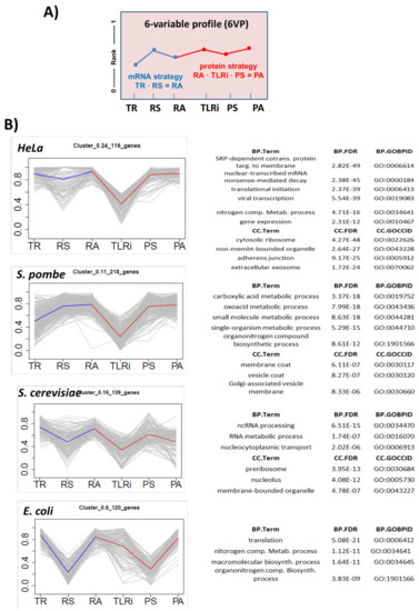 Thus we obtained a 6VP for each gene. This allowed us to compare all the genes for common profiles by means of standard clustering methods. Through this procedure, we found that clusters had genes with similar profiles that were statistically enriched in the Gene Ontology (GO) categories (terms) in all four organisms (Figure 3B, Supplementary Figure S1 and Supplementary Files). This result extends our previous results obtained with S. cerevisiae [3] and demonstrates that common expression strategies (CES) for the genes with a related biological function are a common feature of living beings. It should be noted that the quality of the datasets for the four organisms (see above) can influence clustering quality. We consider that the 6VP is more robust for the two yeasts, and in HeLa at a lower level. For E. coli, the poorer quality of the datasets and the lower quality of the information in the GO annotations for this organism [74] precluded the finding of strongly enriched clusters.
