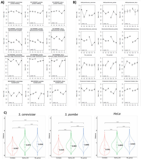 6VPs for the selected GOs and manually curated groups in S. cerevisiae, S. pombe and HeLa cells. (A) We selected four GO terms corresponding to well-known groups of functionally related genes/proteins. The ID of the GO and its name are shown for S. cerevisiae (left), S. pombe (center) and HeLa (right). The maximum number of genes used (maxN) to determine the average value and standard error is shown. In some variables, this number may be lower due to the lack of information for some particular genes in some datasets. In this figure, unlike Figure 3, we independently represent mRNA and protein parts without a connecting line to better display the differences between them. (B) A similar analysis to that in (A), but done with the manually-curated categories that were used in a previous study on S. cerevisiae [3]. (C) Violin plots showing the mean of proximity (values shown on the plots) between the genes coding for the proteins acting in macromolecular complexes (Complex, red) belonging to the same GO, but do not form complexes (Same_GO, green) and other gene pairs that do not belong to the previous groups (No_group, blue). A t-test was applied for the statistical significance of the difference. **** p-value < 2.2 × 10−16 (lowest numerical value displayed in R). An ANOVA also detected a significant difference (p-value < 2.2 × 10−16) among the three gene groups in all the organisms the first time they were cited.