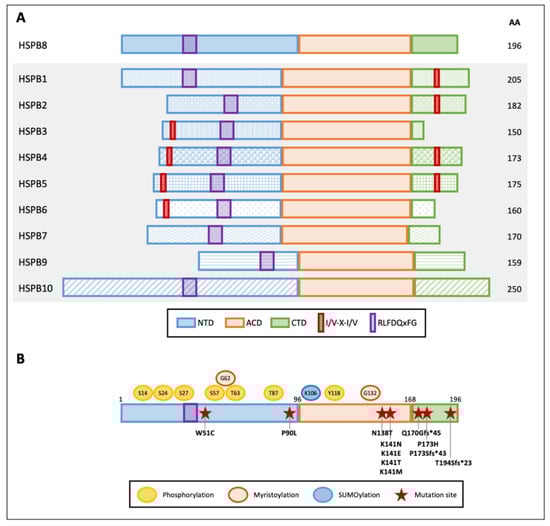 - Shatov, V.M.; Strelkov, S.V.; Gusev, N.B. The Heterooligomerization of Human Small Heat Shock Proteins Is Controlled by Conserved Motif Located in the N-Terminal Domain. Int. J. Mol. Sci. 2020, 21, 4248. [Google Scholar] [CrossRef] [PubMed]