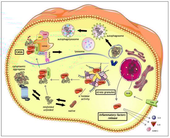 - Crippa, V.; Sau, D.; Rusmini, P.; Boncoraglio, A.; Onesto, E.; Bolzoni, E.; Galbiati, M.; Fontana, E.; Marino, M.; Carra, S.; et al. The small heat shock protein B8 (HspB8) promotes autophagic removal of misfolded proteins involved in amyotrophic lateral sclerosis (ALS). Hum. Mol. Genet. 2010, 19, 3440–3456. [Google Scholar] [CrossRef]
