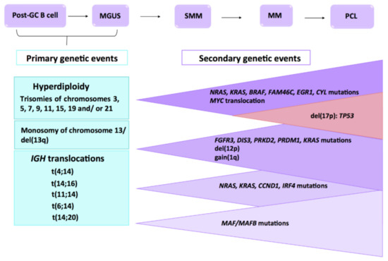 Multistep molecular pathogenesis of multiple myeloma (MM) Primary and secondary genetic events involved in the MM transformation and progression from the precursor disease entities, such as monoclonal gammopathy of undetermined significance (MGUS) and smoldering multiple myeloma (SMM) to MM, and eventually to extramedullary myeloma/plasma cell leukemia (PCL). Adapted from Chesi M et al. and Manier S et al. [4,5].
