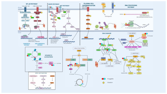 Overview of the main signaling pathways dysregulated in multiple myeloma. Genetic alterations affect essential pathways and biological processes such as NF-κB and MAPK pathways, plasma-cell differentiation, RNA processing, cell cycle, apoptosis, and DNA-damage repair mechanisms. Some druggable targets are indicated.