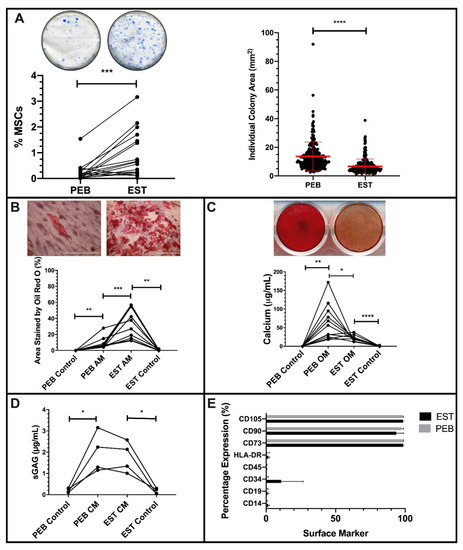 Both populations exhibited tri-lineage differentiation following culture in adipogenic, osteogenic, and chondrogenic media (Figure 1B–D). However, in adipogenic conditions, EST-derived MSCs had a significantly higher level of (p < 0.001) adipogenesis than PEB-derived MSCs, with a 4.9-fold greater area covered by Oil Red O stained lipid vesicles at the end of the assay (Figure 1B).