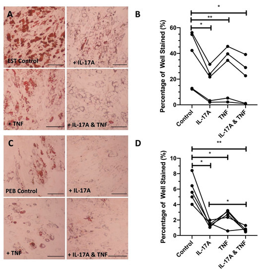 The adipogenesis of both PEB and EST MSCs treated with either IL-17A (p < 0.01), TNF (p < 0.01), or their combination (p < 0.01) was significantly decreased compared to complete adipogenic media without cytokine supplementation (Figure 2).