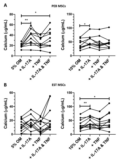 In 5% FCS osteogenic media, TNF induced a small non-significant increase in the osteogenesis of PEB MSCs (1.3-fold increase, Figure 3A). When using the stimulation of both IL-17A and TNF in 5% FCS osteogenic media, there was a significant 1.65-fold increase in calcium accumulation (p < 0.05).