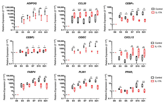 A significant suppression of transcripts relating to vesicle fusion and maturation, as well as to the adipogenic master regulator PPARγ, was evident (Figure 5) [45]. Another transcript that co-operates with PPARγ in mature adipocyte development was CCAAT Enhancer Binding Protein Alpha (CEBPα) [45], which was significantly downregulated by IL-17A stimulation from as early as Day 3 into differentiation (p < 0.01) and remained suppressed at every time point in the differentiation. The vesicle fusion proteins Perilipin-1 (PLIN1) and Cell Death Inducing DFFA like Effector C (CIDEC) were downregulated from day-3 onwards compared to control adipogenic media (p < 0.05 PLIN1, p < 0.01 CIDEC, Figure 5).