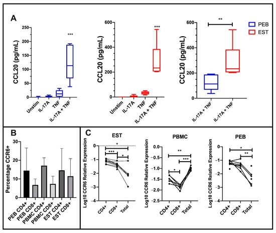 Stimulation using either IL-17A or TNF alone did not significantly increase CCL20 protein secretion from either PEB- or EST-derived MSCs. However, following co-stimulation with IL-17A and TNF, there was a significant increase in CCL20 protein secretion from both PEB MSCs and EST-derived MSCs (both p < 0.001, Figure 6A).