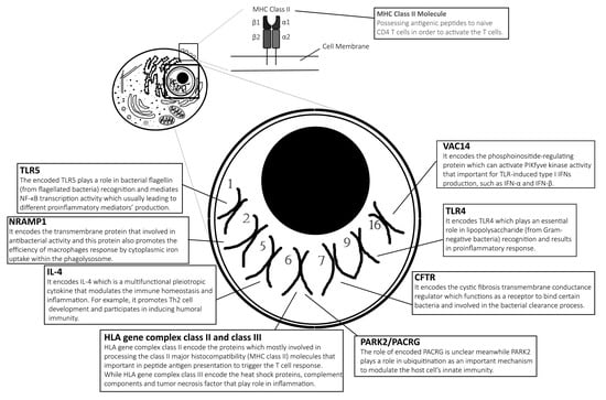 Genes responsible for diverse biological functions. Alteration of the specific genes might affect the susceptibility or severity to Salmonella typhoidal species infection as described and discussed in the content of this review. Notes: This illustration of the eukaryotic cell does not reflect its actual features, while it is just purely for illustration and only seven pairs of chromosomes are represented in this diagram.