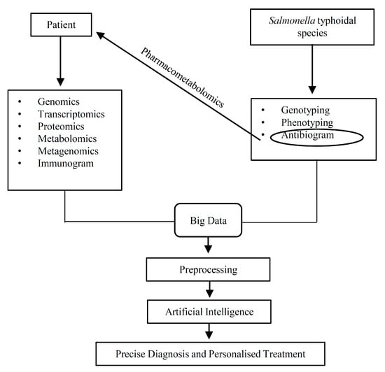Several gene polymorphisms reported here are less involved in the integration of other -omics technologies. There were only a few GWASs which have been integrated with eQTL analysis to identify the promising gene polymorphism that may underlie susceptibility to Salmonella typhoidal species infection. The rationale for integrating the -omics approaches is to complement each other, so that the specific gene polymorphisms associated with the susceptibility to or severity of enteric fever could be confidently pinpointed and provide fundamental biological information under the holistic picture. As aforementioned, epigenetic modification could be found in the genome of the host cells, and the non-coding RNA molecules are also involved in regulating the gene expression for host cell immune response upon infection with pathogen. Therefore, the current approach must integrate with epigenomic techniques such as TET-associated bisulfite sequencing (TAB-seq), oxidative bisulfite sequencing (oxBS-seq), nanopore sequencing, and chromatin immunoprecipitation followed by sequencing (ChIP–seq) to produce the epigenomic maps of the DNA methylation and modified histone landscapes. The current studies are also still lacking in the single-cell RNA sequencing (scRNA-seq) analysis of their samples. The power of this approach is that it offers an ability to investigate the mRNAs as well as non-coding RNA molecules in single cells. As described above, different cells will behave differently, probably due to its unique transcriptome, and thus we foresee the application of scRNA-seq in understanding the single-cell SNPs correlated with enteric fever populations. In addition, molecular typing and antibiogram profiling for S. Typhi and S. Paratyphi could be included in the study. The data might then be useful, particularly, as personalised and precision medicine have garnered much attention lately. Furthermore, this will allow us to have accurate diagnosis and personalised treatment. As illustrated in Figure 2, the integration of the characteristics of Salmonella and ‘-omics’ datasets along with immunoprofiling from respective patients have allowed the exploitation of available biological information into useful and informative outcomes after the pre-processed data are fed into a machine learning model. Such knowledge may reduce the risk of a severe outcome stratification of individuals exposed to Salmonella typhoidal species and allows to more precisely pinpoint the management and needs of individual groups of patients, thereby reducing enteric fever-related complications. As a key example of VAC14 allele of the variant rs8060947 patient, antibiotics such as ciprofloxacin might be prescribed for the clearance of non-multidrug resistant Salmonella sp. together with IFN-γ.
