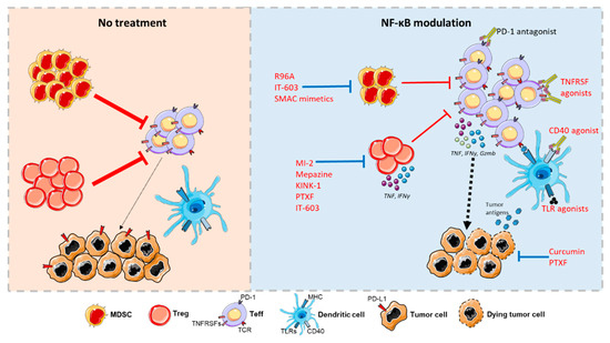 Proposed mechanism for the immunotherapeutic effects of NF-κB modulating agents. In the absence of treatment, MDSCs and Treg cells actively inhibit CD4+ and CD8+ Teff cells; tumor-derived Ag presentation by DCs is low. NF-κB inhibitors increase the numbers and activity of Teff cells by decreasing the recruitment and fitness of MDSCs and impairing Treg cell identity, relieving the suppression of Teff cells. Moreover, these treatments reduce PD-L1 expression and induce tumor cell death, leading to enhanced Ag-presentation by DCs. Conversely, stimulation of TNFRSFs and TLRs on DCs and Teff cells activates NF-κB to increase their maturation numbers and function. All these agents potentiate the therapeutic effect of anti-PD-1 mAbs. Some figure elements were obtained from Servier Medical Art (https://smart.servier.com/).