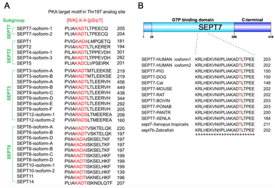 Conservation of PKA target SEPT7 phosphorylation site Thr197 among species. (A) Multiple sequence alignment flanking the analogous Thr197 residue of SEPT7 in 13 different human genes coding for septins. Alignment of the sequences is according to the PKA consensus target motif [R/K]-X-X-[pS/T]. (B) Multiple sequence alignment of analogous sites of Thr197 in the SEPT7 orthologues and comparison of the amino acids in various species. Red indicates that the residues’ alignment was similar. At the bottom, the asterisk denotes an identical residue in all sequences in the alignment. The amino acid sequences were analyzed using the ClustalW2 program at EMBL-EBI.