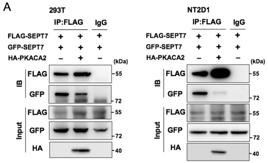 We then checked whether SEPT7 interacted with PKACA2. FLAG-tagged SEPT7 and HA-tagged PKACA2 were co-transfected into NT2/D1 cell lines, followed by an immunoprecipitation assay. PKACA2 was detected in the precipitant of FLAG-SEPT7 and vice versa (Figure 3A,B), suggesting that SEPT7 interacted with PKACA2. Next, the interacting domain of SEPT7 was examined. SEPT7 was dissected into the N-terminus (N’), GTP-binding domain (GBD), and C-terminus (C’). Unfortunately, the expression of N’ of SEPT7 was unstable, so it could not be used for immunoprecipitation assay. We then examined whether the GBD or C’ of SEPT7 interacted with PKACA2. GFP-tagged GBD or C’ was co-transfected with HA-tagged PKACA2 into NT2/D1 cell lines, followed by an immunoprecipitation assay. PKACA2 was detected in the precipitant of GFP-tagged GBD (Figure 3C), but not in the C’ precipitant (Figure 3D), and vice versa. Thus, SEPT7 interacts with PKACA2 via the GBD.