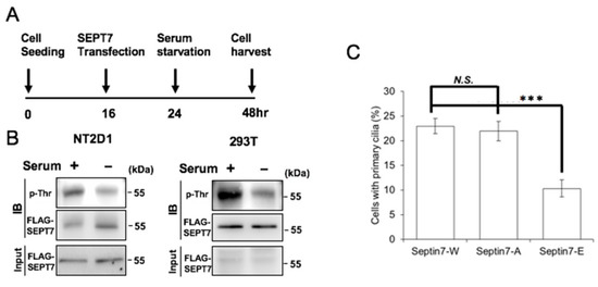 Septin-based ring filaments act as a diffusion barrier at the base of primary cilia [22]. We then investigated whether SEPT7 phosphorylation modulated primary cilia formation. Under serum starvation, cells start to grow primary cilia [29]; we thus checked whether serum starvation affected SEPT7 phosphorylation. Under serum starvation, the phosphorylation of SEPT7 was reduced (Figure 7A,B), suggesting that SEPT7 phosphorylation might affect ciliogenesis. To further confirm our hypothesis, different SEPT7 mutants were transfected into immortalized human retina pigmented epithelial (RPE1) cells, a well-established model for studying ciliogenesis, and the population of ciliated cells was quantified. Transfection of T197A had no effect on ciliogenesis when compared with transfection of wild-type SEPT7. However, the frequency of ciliation was reduced when RPE1 cells were transfected with T197E (Figure 7C). Thus, SEPT7 phosphorylation inhibits primary cilia formation. Then, the role of the cAMP-PKA cascade was examined. Treatment with cAMP reduced the frequency of ciliation and the length of cilia (Figure 7D–F). In addition, the overexpression of PKA significantly inhibited ciliogenesis (Figure 7G). Thus, SEPT7 phosphorylation inhibits ciliogenesis during serum starvation.