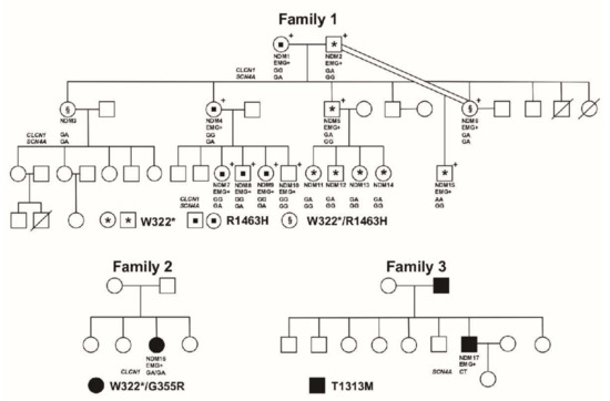 - Maggi, L.; Ravaglia, S.; Farinato, A.; Brugnoni, R.; Altamura, C.; Imbrici, P.; Conte Camerino, D.; Padovani, A.; Mantegazza, R.; Bernasconi, P.; et al. Coexistence of CLCN1 and SCN4A mutations in one family suffering from myotonia. Neurogenetics 2017, 18, 219–225. [Google Scholar] [CrossRef] [PubMed]