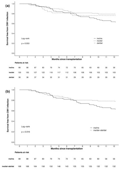 In the Kaplan–Meier analysis of the three genotypes (Figure 1a), a significant difference could just not be observed (p = 0.053). Since we could only identify 38 del/del carriers with nine CMV infections in our patients, we consequently merged heterozygous and homozygous deletion allele carriers into one group. In Kaplan–Meier analysis of the resulting two groups (Figure 1b), patients with the ins/ins genotype were associated with a higher risk of CMV infection than patients with deletion alleles (p = 0.016).