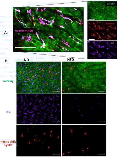 Deposition of neutrophil extracellular traps (NETs) in liver sinusoids during endotoxemia in lean (ND, left) and obese (HFD, right) mice. (A) Representative images of NETs were acquired with Spinning Disk Confocal Intravital Microscopy (SD-IVM) at 24 h of endotoxemia. To visualize colocalization of NET components, the frames from each channel were overlaid. On images autofluorescent hepatocytes (dim green) can be observed in between which sinusoids are localized (black ducts). In the latter structures, neutrophil elastase (NE, violet), histone H2A.X (red), and extracellular DNA (extDNA, bright green) overlaying signal is visible lining along endothelium. (B) Representative images revealing differences in NET deposition (NE and extDNA) and neutrophil numbers in sinusoids of ND and HFD mice at 24 h of endotoxemia. The scale bar indicates 50 μm.