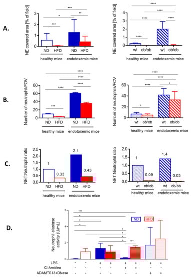 Quantification of neutrophil extracellular trap (NET) formation and neutrophil accumulation in liver sinusoids during endotoxemia in lean and obese mice. The analyses were performed in both models of obesity, in high fat diet (HFD) animals and their controls (ND) (left column), and ob/ob mice and their wild-type counterparts (wt) (right column). (A) Quantitative analysis of NETs within the liver sinusoids: area (%) covered by neutrophil elastase (NE). (B) The numbers of infiltrating neutrophils were quantified with ImageJ v1.53a software and are expressed as number per field of view (FOV). (C) Ratio of NETs to neutrophils was calculated by dividing % of formed NETs by number of neutrophils. A 1 represents arbitrary value for NET formation by neutrophils of healthy either ND (left panel in C) or wt mice (right panel in C). (D) Activity of neutrophil elastase (NE) was measured in blood plasma. The legend under the graph (LPS, Cl-Amidine, ADAMTS13+DNase) refers to treatments received by animals to either induce endotoxemia (lipopolysaccharide, LPS), to block NET formation (Cl-amidine) or to detach NETs from the vasculature (ADAMTS13+DNase). Asterisks indicate significant differences between lean (either ND or wt) and obese (either HFD or ob/ob) mice using unpaired two-tailed Student’s t-test (* p ≤ 0.05, ** p ≤ 0.01, *** p ≤ 0.001, **** p ≤ 0.0001). Data are shown as mean ± s.d.; n ≥ 3 per group.