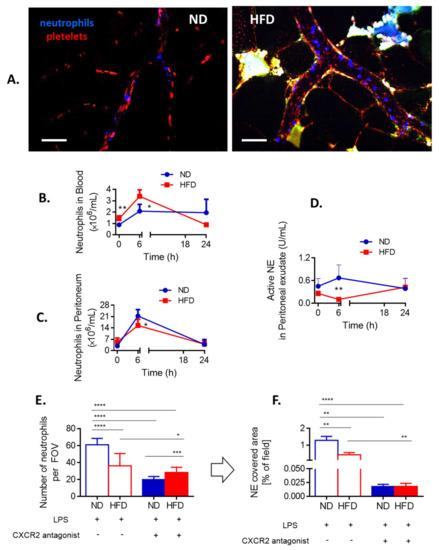 Neutrophil infiltration of the adipose tissue and peripheral tissues, and CXCR2-dependency of neutrophil accumulation in the sinusoids of lean (ND) and obese (HFD) mice. (A) Representative images of the vasculature in the adipose tissue of ND and HFD animals. To visualize blood flow, platelets were stained (red) and neutrophils labelled in blue. Autofluorescent adipose tissue is seen as white/green as the background signal. The scale bar indicates 50 μm. Neutrophil counts in blood (B) and peritoneal lavage (C) were performed with a hemocytometer at different time points of endotoxemia. Additionally, neutrophil elastase (NE) activity was evaluated in the peritoneal exudate (D). To verify if neutrophil infiltration of liver sinusoids depends on a chemokine receptor CXCR2 some ND and HFD mice were pretreated with its antagonist (SB225002) and 24 h after induction of endotoxemia neutrophil infiltration (E) as well as neutrophil extracellular trap (NET) formation (F) in the liver vasculature were estimated. In E-F blue line/filling is always used for NDs and red for HFD mice. Asterisks indicate significant differences between lean (either ND or wt) and obese (either HFD or ob/ob) mice using unpaired two-tailed Student’s t-test (* p ≤ 0.05, ** p ≤ 0.01, *** p ≤ 0.001, **** p ≤ 0.0001). Data are shown as mean ± s.d.; n ≥ 3 per group. We attempted to detect NETs in the vasculature of the adipose tissue but no positive signal for any of their components was spotted at any time. We also verified numbers of neutrophils present in the blood (heart puncture). Although at first more neutrophils were detected in the peripheral blood (6 h) of obese individuals, at 24 h of sepsis their numbers were lower than those found in lean animals (Figure 3B). Thus, at the latter time point the pattern was the same as in liver sinusoids (Figure 2B). Importantly, we verified that also at 6 h of endotoxemia neutrophils of obese individuals were releasing less NETs than those of lean mice despite higher neutrophil counts (Supplementary Figure S6).
