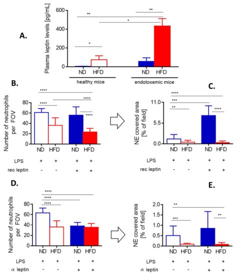 Leptin levels and impact of either exogenous leptin or endogenous leptin neutralization on neutrophil accumulation and neutrophil extracellular trap (NET) formation in liver sinusoids of lean (ND) and obese (HFD) mice. (A) Levels of leptin were compared between untreated (healthy) ND and HFD animals as well as endotoxemic mice, 24 h post lipopolysaccharide (LPS) injection. Some animals received a bolus of exogenous recombinant leptin (rec leptin) prior to endotoxemia induction, and subsequently neutrophil infiltration (B) and NET formation (C) in the liver vasculature were estimated. Control mice received saline. Another group of mice received mouse anti-Leptin/OB antibody to neutralize their endogenous leptin (α leptin) whereas respective controls were injected with an isotype control as detailed in Section 2.4. Upon induction of endotoxemia, neutrophil accumulation (D) and NET formation (E) in liver sinusoids were studied. Asterisks indicate significant differences between ND and HFD mice using unpaired two-tailed Student’s t-test (* p ≤ 0.05, ** p ≤ 0.01, *** p ≤ 0.001, **** p ≤ 0.0001). Data are shown as mean ± s.d.; n ≥ 3 per group.