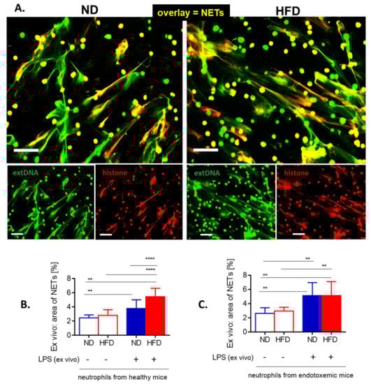 Release of neutrophil extracellular traps (NETs) by isolated bone marrow neutrophils of lean (ND) and obese (HFD) mice. (A) Representative images: NETs were visualized by costaining of citrullinated histone H3 (citH3, red) and extracellular DNA (extDNA, green) and their formation was evaluated 6 h after stimulation with lipopolysaccharide (LPS). The scale bar indicates 50 μm. (B, C) NET quantification: area (%) covered by extDNA. Neutrophils were collected either from healthy mice (B) or mice with LPS-induced endotoxemia (C). Asterisks indicate significant differences using unpaired two-tailed Student’s t-test (** p ≤ 0.01, **** p ≤ 0.0001). Data are shown as mean ± s.d.; n ≥ 3 per group.