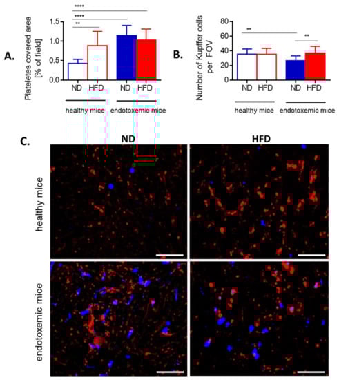 Presence of platelets and Kupffer cells in liver sinusoids of lean (ND) and obese (HFD) mice. (A) Area covered by platelets is expressed as percentage of covered area (as calculated by ImageJ v1.53a), and (B) Kupffer cells were counted per field of view (FOV) on acquired images. (C) Representative images of area covered by platelets (red) and localization of neutrophils (blue). The scale bar indicates 50 μm. Asterisks indicate significant differences using unpaired two-tailed Student’s t-test (** p ≤ 0.01, **** p ≤ 0.0001). Data are shown as mean ± s.d.; n ≥ 3 per group.