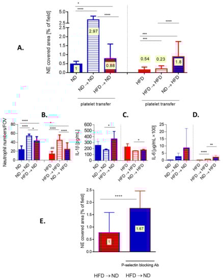 Effects of platelet transfer between lean (ND) and obese (HFD) mice on the formation of neutrophil extracellular traps (NETs), cytokine release and neutrophil accumulation in liver sinusoids. Platelets isolated from blood collected from healthy ND and HFD animals were subsequently intravenously (i.v.) injected into different recipients. Namely, platelets isolated from lean mice were injected into lean mice (ND → ND), platelets isolated from lean mice were injected into obese mice (ND → HFD), platelets isolated from obese mice were injected into lean mice (HFD → ND), and platelets isolated from obese mice were injected into obese mice (HFD → HFD). (A) neutrophil extracellular trap (NET) deposition in liver sinusoids and (B) neutrophil accumulation therein was estimated with intravital microscopy imaging (IVM), and IL-1b (C) and IL-6 (D) release into blood plasma by ELISAs. (E) Additionally, before transfer of platelets isolated from obese mice into lean mice (HFD → ND) they were incubated with P-selectin blocking antibody and NET formation was estimated with IVM. On bars in (A) and (E) ratio of NET-to-neutrophils is plotted (numbers on yellow background). Asterisks indicate significant differences between ND and HFD mice using unpaired two-tailed Student’s t-test (* p ≤ 0.05, ** p ≤ 0.01, *** p ≤ 0.001, **** p ≤ 0.0001). Data are shown as mean ± s.d.; n ≥ 3 per group.