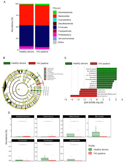Taxonomic differences in fecal microbiota between HIV-1 positive patients and healthy donors. Relative abundance at phylum level (A); Cladogram of LefSe linear discriminant analysis (LDA) scores showing differentially abundant taxonomic clades with an LDA score >2.0 in the gut microbiota of HIV-1 patients and healthy donors (B); LDA scores of differentially abundant taxa in the gut microbiota of HIV-1 patients and healthy donors (C). The relative abundance of genera identified by LefSe as being differentially abundant in HIV-1 patients and healthy donors were compared using a Mann–Whitney test (D). * p < 0.05.