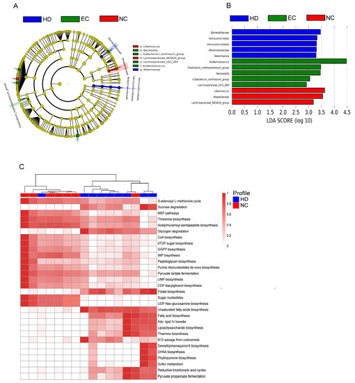 LefSe analysis was used to compare the gut microbiota of EC, NC, and HD groups. Figure 2A,B show differences in the abundance of taxonomic clades of LDA score >2.0 among EC, NC, and HD individuals. The gut microbiota of the EC group was dominated by taxa Acidaminococcus, Clostridium methylpentosum group, Barnesiella, Eubacterium coprostanoligenes group, and Lachnospiraceae UCG-004, whereas the NC group showed high scores for the family Atopobiaceae, and genera Libanicoccus and Lachnospiraceae NK3A20 group. The features identified by LefSe as being differentially abundant were confirmed by standard statistical analysis using Kruskal–Wallis test (Figure S2). PICRUSt analysis was performed to determine whether the taxonomic differences between the groups’ microbiota corresponded to functional changes, but we found no significant differences between HD and EC groups or between EC and NC groups (data not shown). However, we identified 30 KEGG pathways as significantly different between NC and HD groups (Figure 2C). PICRUSt analyses demonstrated that the NC group’s microbiota exhibits increased S-adenosyl-L-methionine cycle, methylerythritol phosphate pathway, and biosynthesis of threonine, acetylmuramoyl pentapeptide, peptidoglycan, CoA, and CDP-diacylglycerol. Conversely, the microbiota of NC subjects was depleted for sucrose and glycogen degradation, biosynthesis of thiamine, folate, fatty acids, unsaturated fatty acids and lipopolysaccharides, B12 Salvage from cobinamide and sulfur metabolism (p < 0.05).