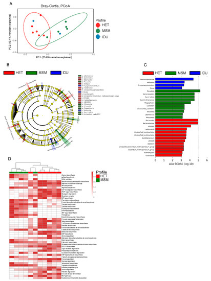 HIV+ patients were divided into three groups according to exposure category: HET (n = 6), MSM (n = 5) and IDU (n = 2). Receptive anal intercourse (r.a.i.), was declared by 2 HET, 5 MSM, and 1 IDU patients. Beta diversity with Principal Coordinates Analysis of Bray-Curtis distances indicated differences in the gut microbiota between HET, MSM, and IDU groups, (R = 0.36, p = 0.011) (Figure 3A). We carried out LEfSe analysis to determine the taxa most associated with the route of HIV-1 transmission and found significant differences in the abundance of 27 taxa among HET, MSM, and IDU groups were found. Bacteroidaceae, Bacteroides, Alistipes, Holdemania, Unclassified lactobacillales, Subdoligranulum, DTU089, UBA1819, Unclassified Clostridium methylpentosum group, Clostridium methylpentosum group, Eisenbergiella, and Odoribacter were enriched in feces of HET group, whereas Aeromonodales, Succinivibrionaaceae, VadinBE97, Prevotella, Succinivibrio, Megasphaera, Unclassified vadinBE97, Allisonella, Libanicoccus, and Mitsuokella were enriched in the MSM group (Figure 3B,C). When differences in microbiota functions were assessed, 20 pathways were found to be strengthened, and 30 pathways weakened in MSM in relation to the HET group (Figure 3D). Alanine biosynthesis, metabolic regulators, sulfur oxidation, and biosynthesis of arginine carbohydrates, biotin, fatty acid, and tryptophan were among the enriched pathways in the MSM group compared to the HET group, while biosynthesis of valine, histidine, phospholipid, acetylmuramoyl pentapeptide, as well as purine, glycogen and sucrose degradation, were depleted (p < 0.05).