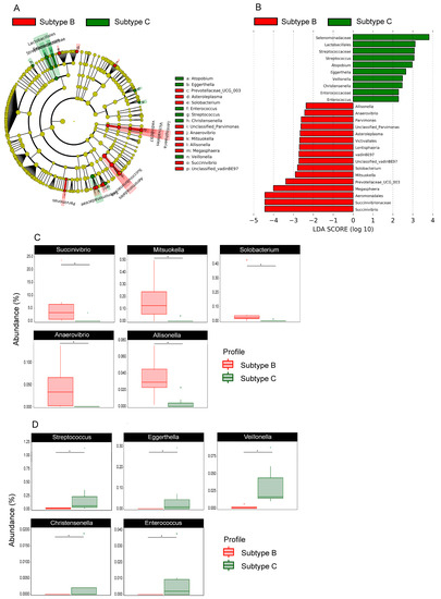 Effects on the gut microbiota according to HIV subtype B and C. LEfSe results for the bacterial taxa that were significantly different between HIV-B and HIV-C infected patients. The cladogram shows differentially abundant taxonomic clades (A) and LDA scores showing significant differences between groups (B). The relative abundance of genus identified by LEfSe as being differentially more abundant in HIV positive patients infected by HIV subtype B (C) and subtype C (D) were compared using a Mann–Whitney test. * p values <0.05.