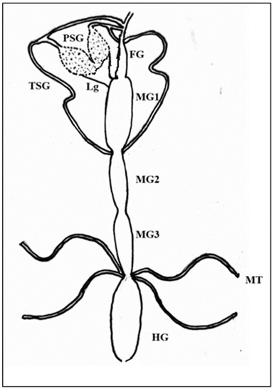 Schematic diagram of alimentary canal and salivary glands of Thrips palmi. FG—foregut; MG1—midgut 1; MG2—midgut 2; MG3—midgut 3; HG—hindgut; PSG—principal salivary gland; TSG—tubular salivary gland; Lg—ligament; MT—Malpighian tubules. PSG is connected to the anterior midgut by ligaments. TSG originates from the basal region of PSG and meets the alimentary canal at the junction of MG1 and MG2.