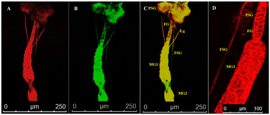 Salivary glands had two parts, the principal salivary glands (PSG) and TSG. The PSG appeared as a paired ovoid structure that was connected through a small piece of tissue. The PSG was placed between the head and prothorax in larvae. A pair of ligaments connected the basal region of the PSG to the anterior midgut 1 (Figure 2). The TSG emerged from the basal regions of the gland, led down the alimentary canal, and touched at the junction of MG1 and MG2. The TSG was about 372 µm long and 3.4 µm in diameter.