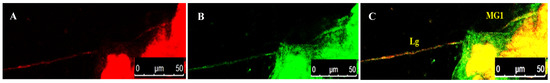 Accumulation of WBNV in ligaments connecting PSG to anterior midgut during P2 stage of Thrips palmi. (A). Alexa Fluor 594 phalloidin-conjugated F-actin probe red fluorescence (B). FITC-conjugated goat anti-rabbit secondary antibody green fluorescence indicating WBNV-N protein (C). Merged image of red and green fluorescence signals. MG1—midgut 1; Lg—ligament. Ligaments connecting midgut to PSG were intact during pupal stages. WBNV infection was detected in ligaments connecting MG1 to PSG.