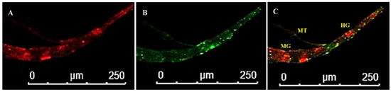 WBNV accumulation in hindgut and Malpighian tubules during P2 stage of Thrips palmi. (A). Alexa Fluor 594 phalloidin-conjugated F-actin probe red fluorescence (B). FITC-conjugated goat anti-rabbit secondary antibody green fluorescence indicating WBNV-N protein (C). Merged image of red and green fluorescence signals. HG—hindgut; MG—midgut; and MT—Malpighian tubules. WBNV infection was distinguished by FITC green fluorescence in hindgut and Malpighian tubules in P2, 8 days post acquisition.