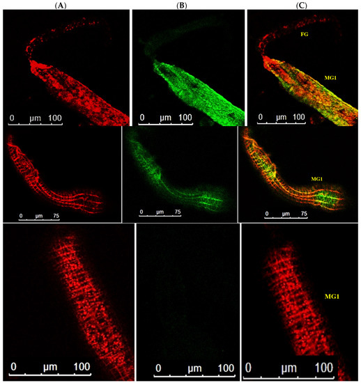 Accumulation of WBNV in anterior midgut of Thrips palmi adult. (A). Alexa Fluor 594 phalloidin-conjugated F-actin probe red fluorescence (B). FITC-conjugated goat anti-rabbit secondary antibody green fluorescence indicating WBNV-N protein (C). Merged image of red and green fluorescence signals. FG—foregut; MG1—midgut 1. Level of WBNV infection was highest in anterior midgut (top panel). Green fluorescence indicating WBNV N protein increased in midgut 12 days post acquisition. Infection of longitudinal and circular muscle cells of the midgut was evident by presence of green fluorescence (middle panel). No FITC green fluorescence was observed in the midgut of aviruliferous T. palmi (bottom panel).