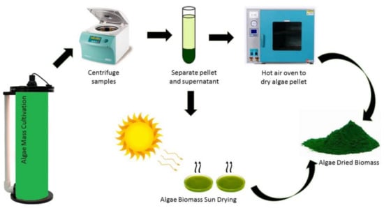 To measure microalgae biomass, microalgae culture may be filtered through a preweighed Whatman GF/C filter paper and then the filter paper is dried in an oven [3,6,18,24]. The difference between the final weight and weight before filtration is the dry biomass weight of the microalgae. Besides that, microalgae biomass also can be determined by sun drying as illustrated in Figure 3. However, the sun drying method is not effective in high humidity countries due to the high water content in microalgae biomass, often leading to unpleasant odors due to potential bacterial contamination [61].