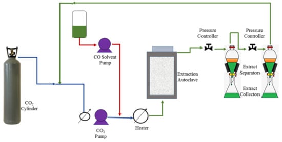 According to King, [76] the supercritical fluid extraction method (SEF) can be used to extract lipids without using any organic solvent for analysis. This SEF method requires high energy consumption that is expensive for commercialization. The SEF method can separate lipids according to properties, enrichment, hydrogenation and hydrolysis. Figure 4 illustrates microalgae lipid extraction using SEF methods. Santana et al. [77] reported the use of the SEF method to extract lipids from Botryococcus braunii for biodiesel production. They observed that the lipid yield decreased with an increase in the temperature of extraction. However, the pressure enhancement has a positive influence on lipids productivity. The optimum operating conditions for SEF was in the range of 220–250 bar for pressure and 50 °C for temperature, respectively. Similar results were carried out in Nannochloropsis salina, Scenedesmus obliquus and Scenedesmus obtusiusulus for extraction of lipids to generate biodiesel [52,78]. SEF optimum conditions to generate 92% of lipids was performed at 12 MPa, 20 °C, and a CO2 to biomass ratio of 100 [52].