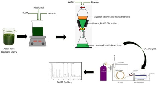 A modified one-step in situ transesterification method (IST) was used to quantify fatty acid methyl ester (FAME) and it has been used by Zarrinmehr et al. [7] and Tang et al. [84]. Transesterification is the most common, less energy-consuming process to exchange pre-existent ester linkage using an acid or basic catalyst to release methanol and glycerol from synthesized fatty acid methyl esters [24]. According to Tang et al. [84], transesterification was related to the direct conversion of microalgal lipids into fatty acid methyl esters (FAME), either using acid or alkaline catalysts. This IST can be performed without lipid extraction technique (Figure 6). Besides that, this IST technique was widely used due to the high accuracy, simplicity and reliability. Generally, saturated fatty acids (SFA) possess a high cetane number and better oxidative stability. Microalgae with a high percentage of C18:1 were valuable components for biofuel production [85]. Higher cetane number is a prerequisite for reduced NO2 emission to the atmosphere [86]. According to Praveenkumar et al. [86], Chlorella sp. had potential as an alternative to biodiesel when cultivated in nitrogen-deficient conditions compared to phosphorus-limited conditions. An increase in unsaturated fatty acids is usually undesirable for biofuel production as it leads to a low cetane number, thereby enhancing NO2 emission, oxidation and lubricity of biofuels [86]. Hence, the biofuels must have a high amount of saturated and monounsaturated fatty acids with low levels of polyunsaturated fatty acids.