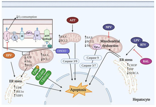 Generally, the molecular mechanisms of NRTI-driven liver injury involve alterations in cell morphology, mitochondrial integrity, and endoplasmic reticulum (ER) function, which can lead to altered mitochondrial bioenergetics and toxicity, hypersensitivity reactions, and hepatic steatosis [65]. Below, we describe their effects regarding apoptosis in the liver. For NRTIs to be effective, they need to be taken up by the host cell, phosphorylated to the triphosphate form, bind at the polymerase active site, mimic a substrate that can be incorporated into viral DNA by HIV RT, and, finally, act as chain terminators. The main toxicity of these drugs is due to inhibition of DNA polymerase γ, an enzyme required for mitochondrial DNA (mtDNA) replication [66]. mtDNA encodes 13 subunits of the electron transport chain (ETC) that are essential to oxidative phosphorylation. Therefore, in addition to apoptosis, NRTI-induced depletion of mtDNA leads to enhanced mitochondrial ROS production and an impairment of fatty acid oxidation and microvesicular hepatic steatosis [67].
