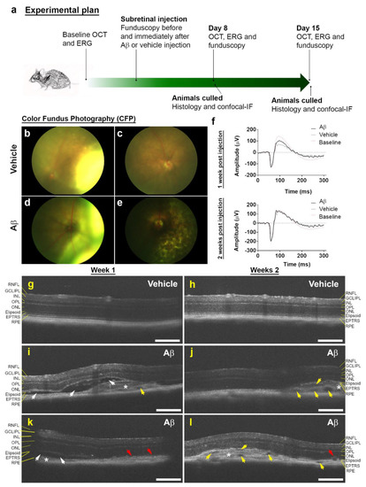 To study Aβ effects in living eyes, wild-type C57BL/6J mice were subretinally injected with a single dose of human oligomeric Aβ1-42. As Aβ levels in ocular fluids are reported to be in the picomolar to nanomolar range [37], we used 1.5 μL of 625 nM Aβ1-42 in our experiments. A timeline of the experiment is shown in Figure 1a. Retinae imaged by CFP revealed evidence of pathology in Aβ-injected eyes consisting of patchy pigmentary loss. In contrast, control eyes injected with vehicle appeared normal once retinas had fully reattached following subretinal injection (Figure 1b–e).