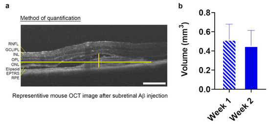 Our findings show that within a 1.4 mm2 scan area, no significant differences were recorded between Aβ- vs. vehicle-injected eyes for any specific retinal layer or indeed for total retinal thickness when measured across the whole retina. Measurement of the lesion volume in each Aβ-injected eye showed a 0.52 ± 0.12 mm3 SEM area of damage at 1 week, and an area of 0.45 ± 0.16 mm3 SEM at 2 weeks (Figure 2a,b and Supplementary AVI Files of OCT scans).