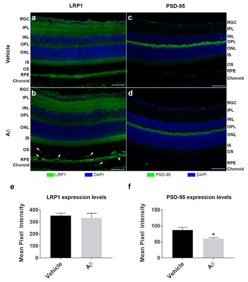 Mouse eyes were also probed for the low-density lipoprotein receptor-related protein 1 (LRP1) to assess whether Aβ had elicited a potential change in the expression of this well-known Aβ-clearance transporter (Figure 4a,b). Diffuse LRP1 expression was observed throughout the neuroretina of Aβ or vehicle-treated eyes with particularly strong expression in the RPE. We also probed for PSD-95 to determine whether Aβ had disrupted synaptic connections between the inner and outer retina (Figure 4c,d and Figure S4). Fluorescence intensities for LRP1 and PSD-95 were recorded in the retina and associated tissue layers and presented as combined average mean pixel values. LRP1: 353.2 ± 19.9 SEM in vehicle control and 333.3 ± 38.7 SEM in Aβ-treated eyes. PSD-95: 87.2 ± 8.4 SEM in vehicle control and 60.4 ± 3.0 SEM in Aβ-treated eyes (Figure 4e,f). No differences in LRP1 expression were observed between control vs. Aβ-treated eyes. By contrast, Aβ exposure resulted in a significant reduction in PSD-95 expression after 2 weeks.